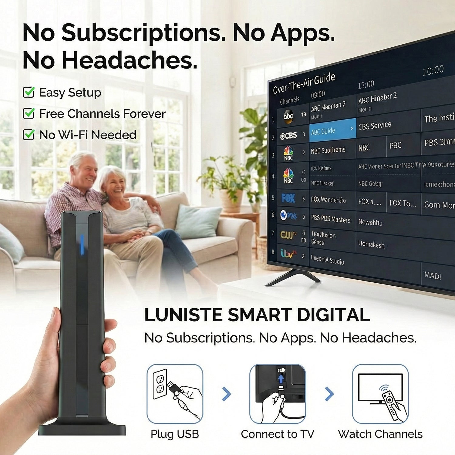 - Plug. Scan. Relax: No tools, no drilling, and no degree in engineering required. Plug it into your TV’s coaxial port, run a quick channel scan, and start watching in under 3 minutes.